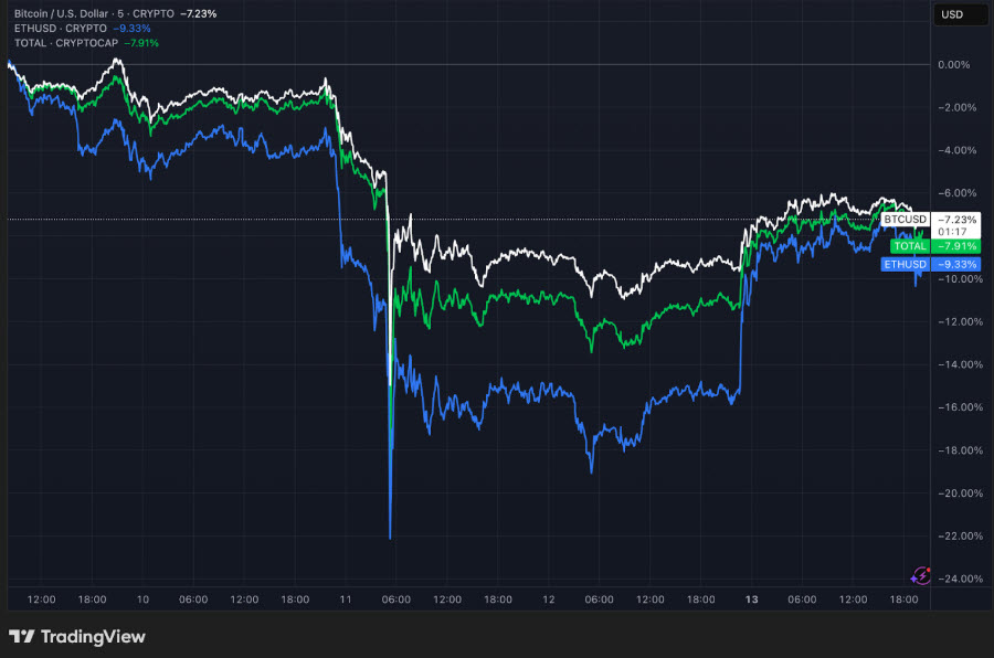 สัปดาห์ที่ผ่านมา ตลาดเผชิญกับแรงเทขายอย่างหนักจนเกิดการล้างพอร์ตมูลค่าราว 19,000 ล้านดอลลาร์ สร้างความผันผวนอย่างรุนแรง โดยราคา Bitcoin ร่วงสู่ระดับ 110,000 ดอลลาร์ ขณะที่ Ethereum ร่วงสู่ระดับ 3,500 ดอลลาร์