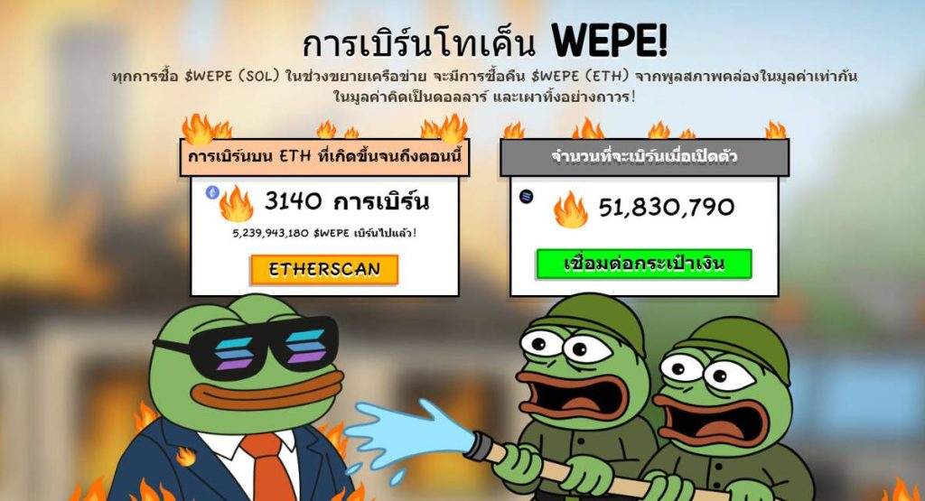 โปรเจกต์ Wall Street Pepe เพิ่งเสร็จสิ้นกิจกรรม Solana Early Access ซึ่งประสบความสำเร็จในการเผาโทเคนจำนวน 5,200 ล้านโทเคน กลไกดังกล่าวทำงานโดยเมื่อมีผู้ซื้อโทเคนบน Solana ระบบจะทำการเผาโทเคนบน Ethereum ในมูลค่าที่เท่ากัน (คำนวณที่ราคา 0.001 ดอลลาร์ต่อโทเคน)
