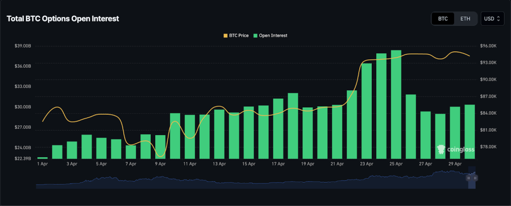 ในขณะที่ตลาดอนุพันธ์ก็แสดงถึงกิจกรรมการเก็งกำไรที่เพิ่มขึ้น โดยข้อมูลจาก Coinglass ระบุว่า open interest ของ BTC เพิ่มขึ้น 1 พันล้านดอลลาร์ในช่วงวันที่ 28–30 เมษายน ขณะที่ Ethereum (ETH) มี open interest เพิ่มขึ้น 150 ล้านดอลลาร์