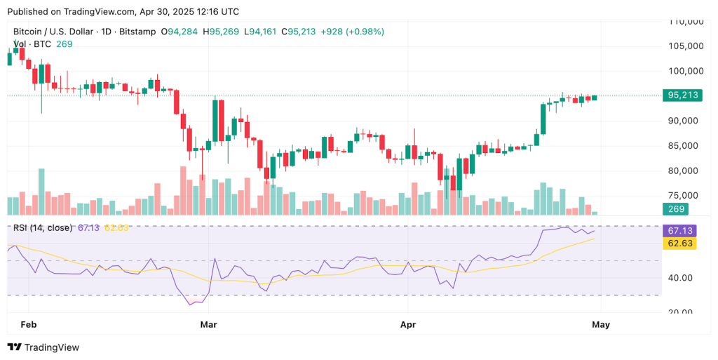 ปัจจุบัน Bitcoin กำลังเคลื่อนไหวในช่วงราคา $94,000–$95,000 โดยมีแนวต้านสำคัญที่ $98,000 และแนวรับใกล้บริเวณ $85,000–$87,000 ซึ่งสัญญาณทางเทคนิคยังคงปนๆ กันไป