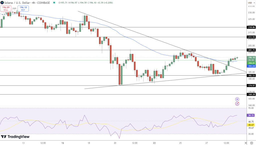 ราคา Solana ได้ทะลุกรอบสามเหลี่ยมสมมาตร (Symmetrical Triangle) ที่ระดับ 196.10 ดอลลาร์ แสดงให้เห็นว่าราคาน่าจะขึ้นต่อไป โดยมีแนวต้านถัดไปอยู่ที่ 201.75 ดอลลาร์ และถ้าผ่านไปได้ เป้าหมายถัดไปก็จะอยู่ที่ 211.55 และ 218.86 ดอลลาร์