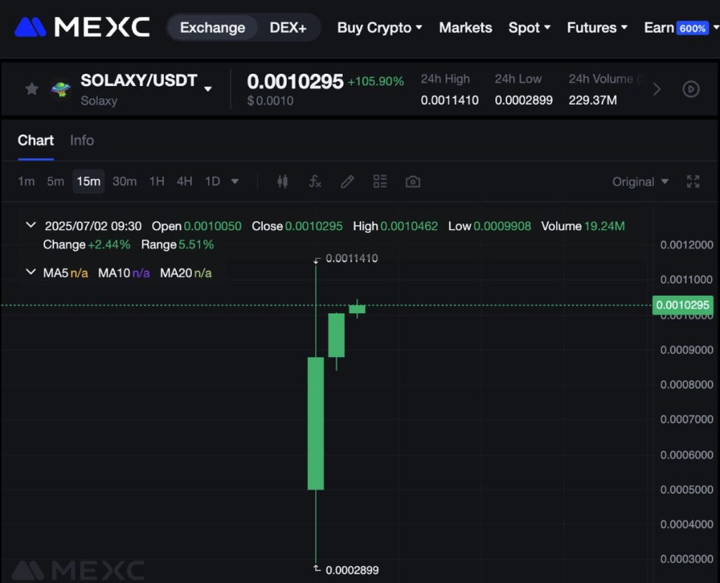 การลิสต์เหรียญ Solaxy บน MEXC ได้เริ่มขึ้นอย่างเป็นทางการเมื่อวันพุธที่ 2 กรกฎาคม เวลา 8:00 น. UTC และราคาก็ปรับตัวขึ้นทันทีกว่า 105% บนกระดานเทรดที่ราคา 0.00102 ดอลลาร์ การเข้าเทรดบน MEXC ถือเป็นเพียงจุดเริ่มต้นของการขยายตัวในวงกว้างของ Solaxy เท่านั้น นอกจากนี้ยังมีการยืนยันว่าจะมีการลิสต์บนกระดานเทรดชั้นนำอื่นๆ อีกหลายแห่งภายในสัปดาห์นี้ ซึ่งแสดงให้เห็นว่าทีมงาน Solaxy กำลังดำเนินการตามแผนงานที่วางไว้อย่างรวดเร็ว