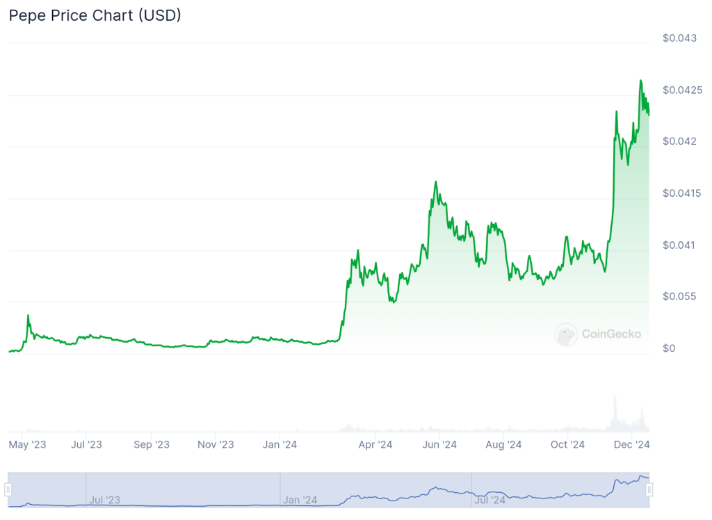 เหรียญมีมได้กลายเป็นหมวดหมู่การลงทุนที่มีความสำคัญในปี 2024 โดยติดอันดับ 20 ของตลาดคริปโตที่มีมูลค่ารวมสูงถึง 1.2 แสนล้านดอลลาร์ และ $PEPE คือแรงขับเคลื่อนหลักของการเติบโตอย่างก้าวกระโดดนี้