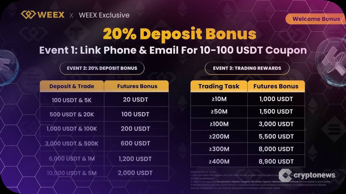 WEEX แพลตฟอร์มซื้อขายคริปโตที่มีจุดเด่นในด้านความปลอดภัยและสภาพคล่องสูง ได้เปิดตัวโปรแกรมส่งเสริมการใช้งานใหม่สำหรับผู้ใช้งานที่เพิ่งสมัครสมาชิก โดยมอบสิทธิพิเศษ 3 รูปแบบ ได้แก่ คูปองมูลค่า 10–100 USDT สำหรับผู้ที่สมัครใช้งานครั้งแรก โบนัสเงินฝาก 20% และรางวัลจากการเทรดสัญญาฟิวเจอร์สตามระดับสูงสุดถึง 8,900 USDT