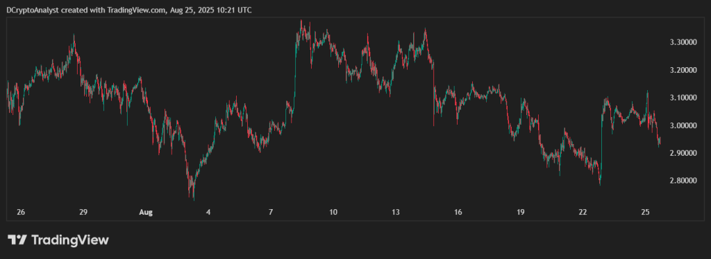 ในช่วง 24 ชั่วโมงที่ผ่านมา ราคา XRP ได้ปรับตัวขึ้นกว่า 3% โดยเคลื่อนไหวระหว่าง $3.02 ถึง $3.09 ก่อนจะกลับมาทรงตัวที่ระดับ $3.02 อีกครั้ง สิ่งที่น่าสนใจคือปริมาณการซื้อขายที่พุ่งสูงถึง 58.8 ล้านดอลลาร์ ซึ่งสูงกว่าค่าเฉลี่ยปกติที่ 33.2 ล้านดอลลาร์อย่างชัดเจน สะท้อนให้เห็นถึงความสนใจจากนักลงทุนสถาบันที่เพิ่มมากขึ้น