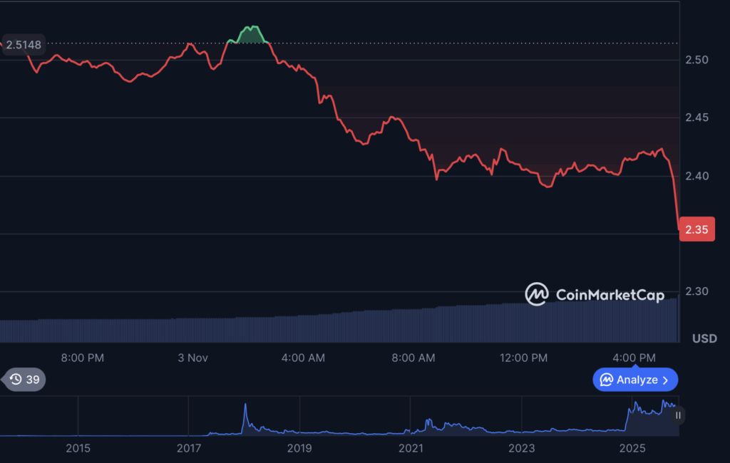 เหรียญ XRP ของ Ripple ได้สูญเสียมูลค่าไปเกือบ 20% ในช่วงเดือนที่ผ่านมา ซึ่งเป็นการปรับฐานครั้งสำคัญหลังจากช่วงขาขึ้นก่อนหน้านี้ นักวิเคราะห์มองว่าสถานการณ์นี้เป็นเพียง “ช่วงพักตัว (cooling phase)” มากกว่าการล่มสลาย แต่ความไม่แน่นอนก็ทำให้นักลงทุนต้องใช้ความระมัดระวังเป็นพิเศษ ซึ่งสอดคล้องกับบทวิเคราะห์ราคาและอนาคตของเหรียญ XRP ที่ชี้ว่าตลาดยังคงมีความผันผวนสูง ณ เวลาที่เขียนบทความนี้ ราคา XRP ซื้อขายอยู่ที่ประมาณ $2.35 ซึ่งลดลงประมาณ 6% จากวันก่อนหน้า