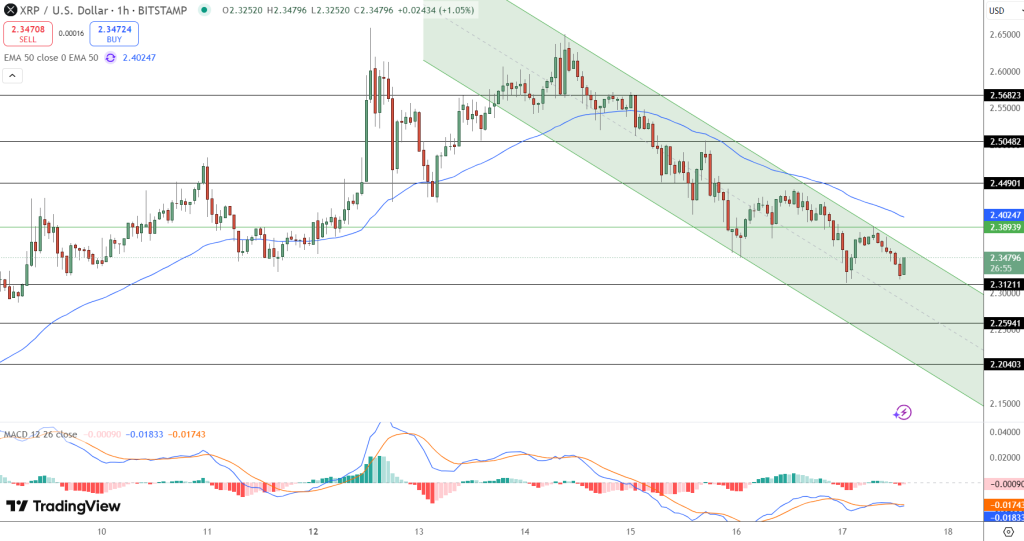 จากมุมมองทางเทคนิค ราคา XRP กำลังเคลื่อนที่อยู่ในช่องทางขาลงบนกราฟรายชั่วโมงที่ระดับ 2.35 ดอลลาร์