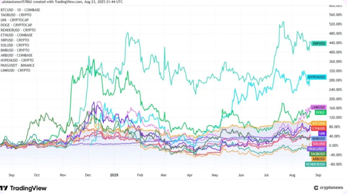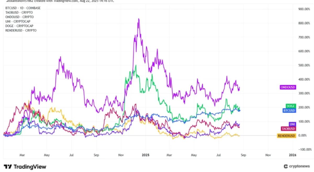Bu grafik, geçen yıl boyunca en iyi kripto paralar arasındaki korelasyonu göstermektedir. İlginç bir şekilde, Hyperliquid (HYPE) ve Bittensor (TAO) Bitcoin ve diğer çoğu varlıkla en düşük korelasyonu göstermiştir. Bu projeler, çeşitlendirilmiş bir portföy için harika seçeneklerdir.