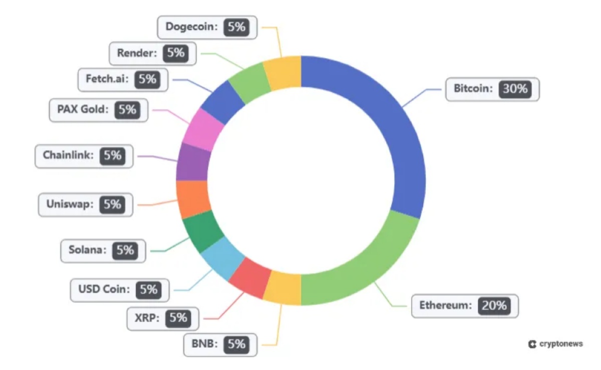 Bu örnek için Final Crypto Tool kullanarak bir kripto portföyü simüle ettik. Portföyde Bitcoin’e %30 ve Ethereum’a %20 tahsis edilmiştir. Kalan %50 pay ise yapay zeka, internet fenomeni coinleri, gerçek dünya varlıkları ve altyapı dahil olmak üzere farklı blok zincir sektörlerini temsil eden alternatif coinlere ayrılmıştır.