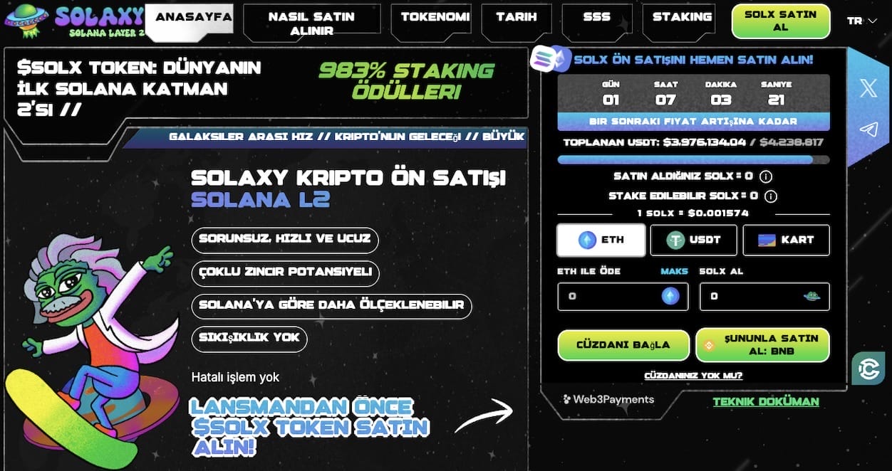 “Solaxy nasıl alınır?” sorusuna adım adım cevap verdik. Peki Solaxy dürüst bir proje olsa da, kripto ön satış dünyasında, dikkatli olmazsanız varlıklarınızı etkileyebilecek kimlik avı veya sahte web siteleri de dahil olmak üzere birçok dolandırıcılık vardır. İşte $SOLX’a yatırım yaparken güvende kalmanızı sağlayacak bazı ipuçları.