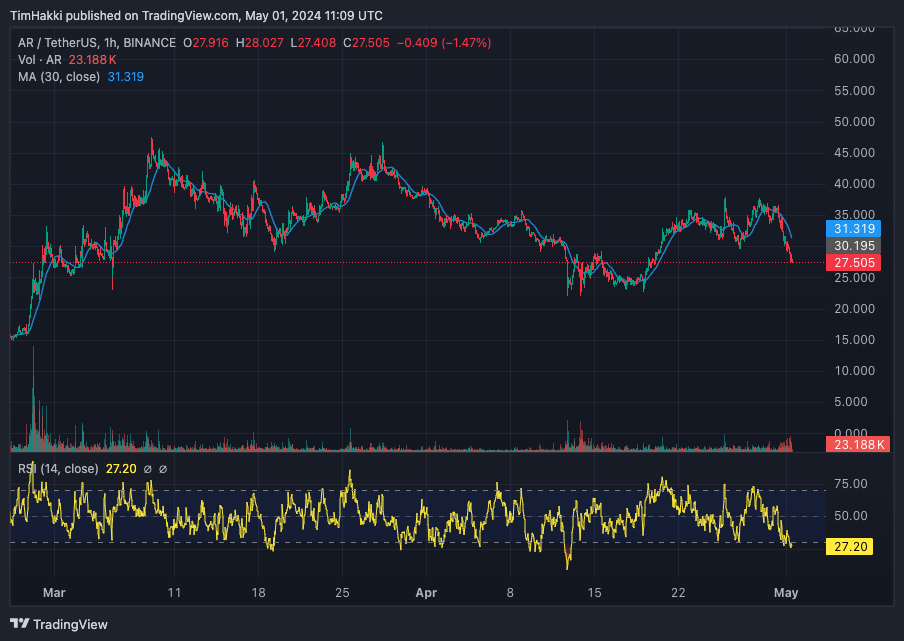 Arweave (AR) token, Bitcoin (BTC) liderliğindeki genel piyasa çöküşü sırasında ağır kayıplar yaşayarak, bir gecede %18,7 değer kaybetti. CoinGecko verilerine göre, Arweave son kayıplarının bir kısmını telafi ederek şu anda 29,23 dolar seviyesinden işlem görüyor ve son 7 günde %13 kayıp gösteriyor.