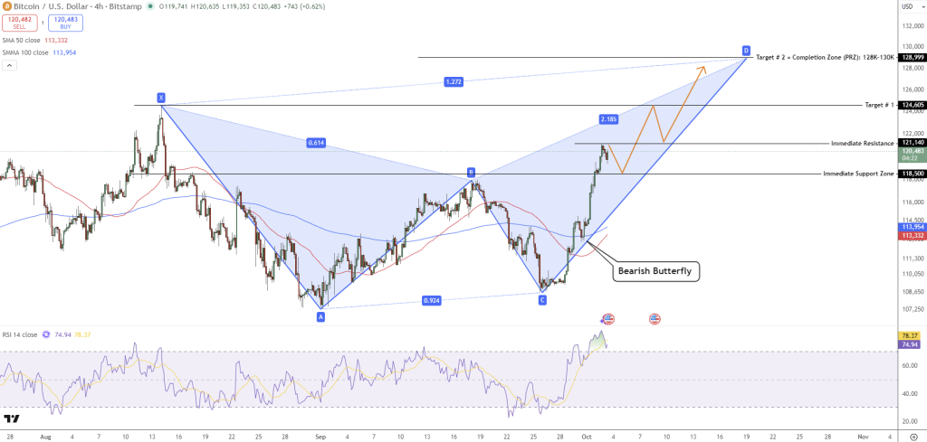 Bitcoin, genellikle rallinin tepe noktası yakınlarında tükenişin bir işareti olan harmonik kelebek formasyonu oluşturutor.