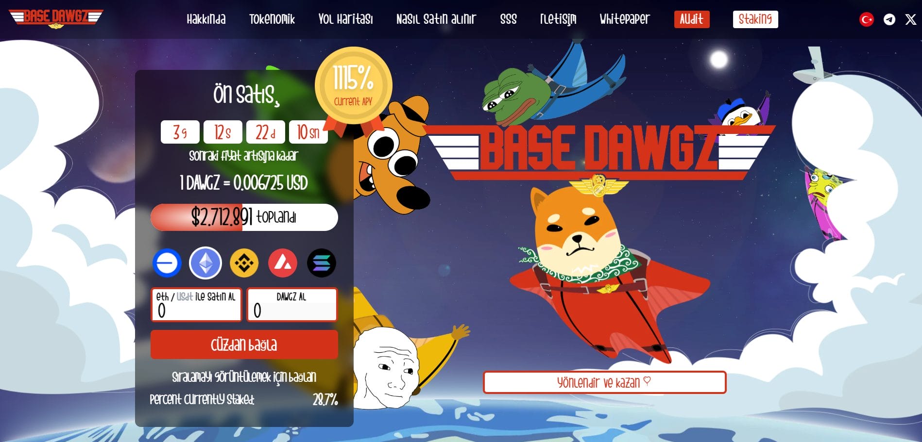 Base Dawgz web sitesini ziyaret edin, cüzdanınızı bağlayın ve $DAWGZ satın almak için Base (ETH, USDC), ETH (ETH/USDT), SOL, BSC (BNB/USDT) veya AVAX kullanın.