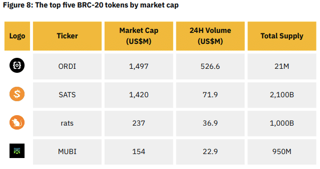 Raporda, BRC-20 token ekosisteminin önde gelen temsilcileri olarak ORDI tokenlerinin başarısına dikkat çekildi. 1 bin adet mint limiti ve 21 milyon maksimum arz ile ORDI, sektörün en popüler merkezi kripto borsalarında listelendi. Bunu takiben, SAT tokenları ve MUBI BRC-20 tokenları gibi diğer tokenlar da popülerlik kazandı.