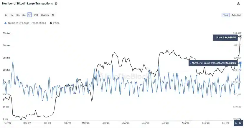 Kripto analiz şirketi IntoTheBlock tarafından sağlanan bilgilere göre, Bitcoin blockchain’inde gerçekleşen 100.000 dolar ve üzeri büyük işlemlerin miktarı, geçtiğimiz hafta içinde 2023 yılının en yüksek düzeyine ulaştı.