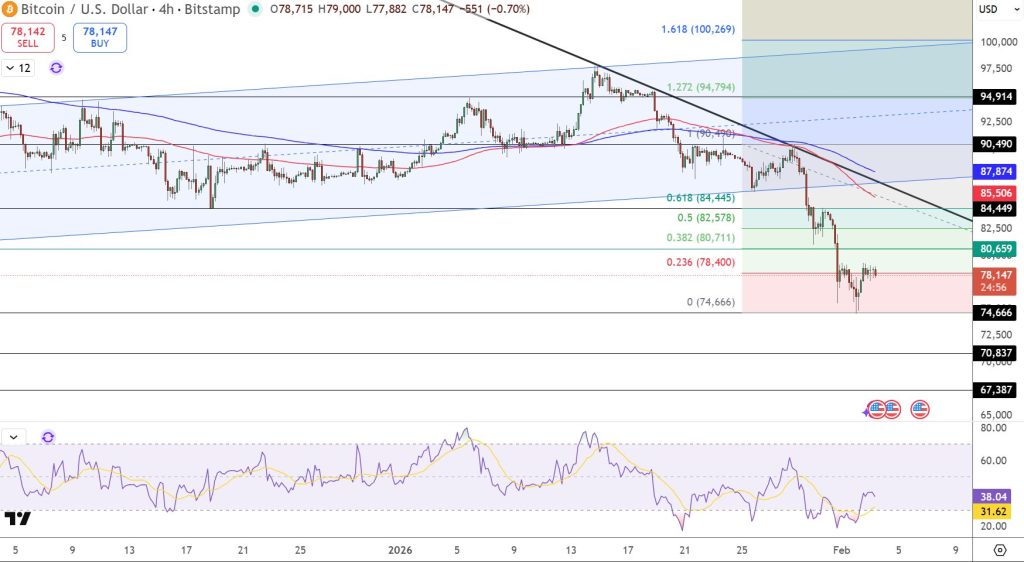 Bitcoin fiyat tahmini şu an için düşüş ağırlıklı bir seyir izliyor. Günlük grafiklerde, azalan direnç seviyeleri ile kritik Fibonacci desteği arasında bir mücadele gözlemleniyor. BTC şu anda 78.400 dolardaki 0,236 Fibonacci seviyesini test ediyor. 74.666 dolarlık bir sonraki desteğe gerilememek için bu seviyenin üzerinde kalması büyük önem taşıyor.