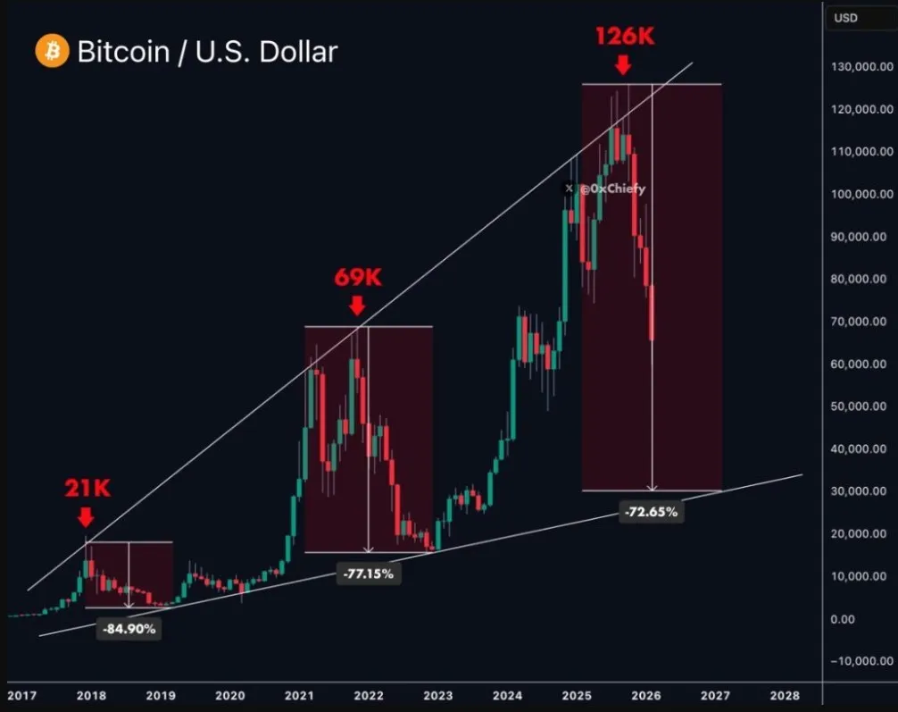 Veriler, mevcut döngüyü 2017 ve 2021 düzeltmeleriyle karşılaştırıyor. NASDAQ, Şubat ayında Bitcoin’in 60.000 dolar altına sarkacağını bekliyor.