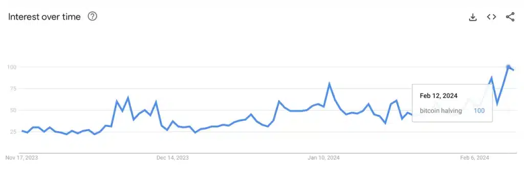 24 Ocak 2024 tarihine gelindiğinde, “bitcoin halving” terimi zaten 100 üzerinden 40 puanlık bir skora ulaşmıştı ve Pazartesi gününe kadar sürekli artarak zirveye ulaştı. Bu yazı yazılırken, arama sorgusu 100 üzerinden 96 gibi yüksek bir puanı koruyor.