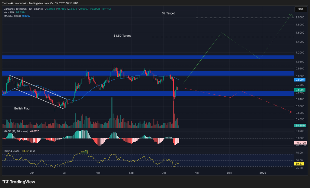 Şu anda 0,6993 dolar seviyesinde işlem gören ADA, son 24 saatte %4 yükselerek çöküş sonrası güçlü bir birikim sinyali verdi. Olumlu makroekonomik koşullarda, ADA sonbaharda 1,50 dolara, yıl sonunda ise 3,09 dolarlık ATH’sini yeniden test edebilir.