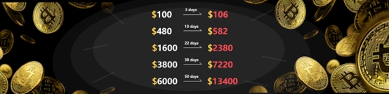 Örneğin, 100 dolarlık plana yatırım yapmak, 3 günlük sözleşme süresinde 6 dolarlık bir getiri sağlar.