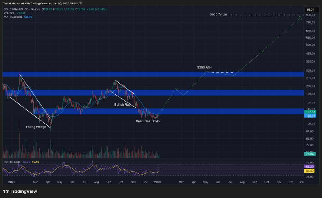 2025’in son çeyreğinde yaşanan sert düzeltmenin ardından SOL yaklaşık 138 dolar seviyelerinde işlem görüyor. Claude AI, iyimser bir senaryoda fiyatın yüzde 550 artışla 900 dolara kadar yükselebileceğini öngörüyor. Bu seviye, Ocak ayında görülen 293 dolarlık önceki zirvenin yaklaşık üç katına karşılık geliyor.