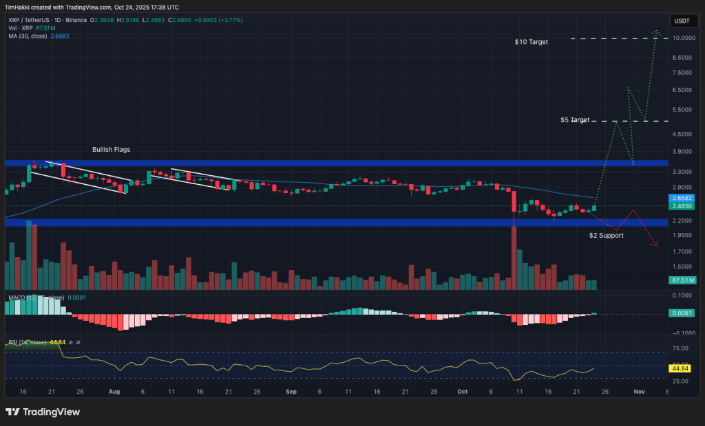 Son 12 ayda, XRP %369 gibi devasa bir artış göstererek Bitcoin’in %63’lük ve Ethereum’un %55’lik kazançlarını geride bıraktı. Teknik göstergeler, 2025’te üç dikkat çekici boğa bayrağı formasyonuna işaret ediyor; bu formasyonlar genellikle önemli yukarı yönlü hareketlerin habercisi olarak kabul edilir.