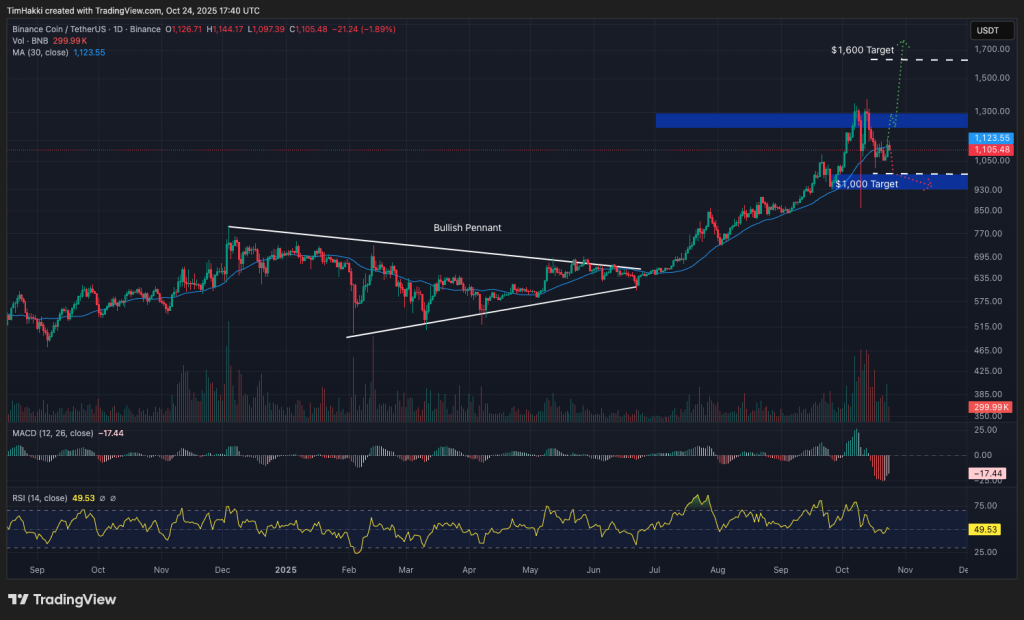 Bu ayın başlarında, boğa flama formasyonundan çıkan BNB, yaklaşık %19 geri çekilmeden önce 1.369,99 dolar ile tüm zamanların en yüksek seviyesine (ATH) ulaşmıştı. RSI’ının şu anda 50 civarında seyretmesi, token’ın konsolide olduğunu gösteriyor.