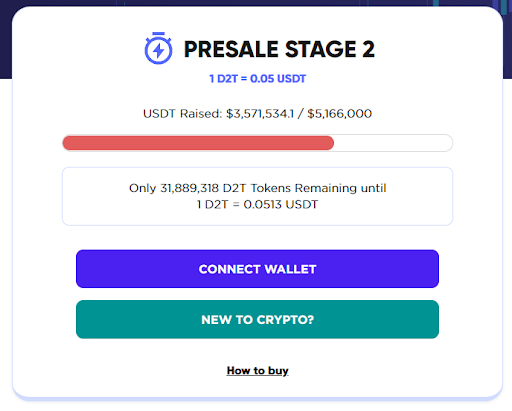Ön satış şu anda Dash 2 Trade web sitesinde yayında ve Dash 2 Trade’i tüm kripto endüstrisindeki en iyi ticaret platformu yapma hedeflerini ilerletmek için 3,5 milyon dolar toplandı. D2T’nin fiyatı, ön satışın çeşitli aşamalarında kademeli olarak artacaktır. Bu, daha erken katılanların, daha sonra veya listelemede katılanlardan çok daha iyi fiyatlarla D2T token elde edebilecekleri anlamına gelir.