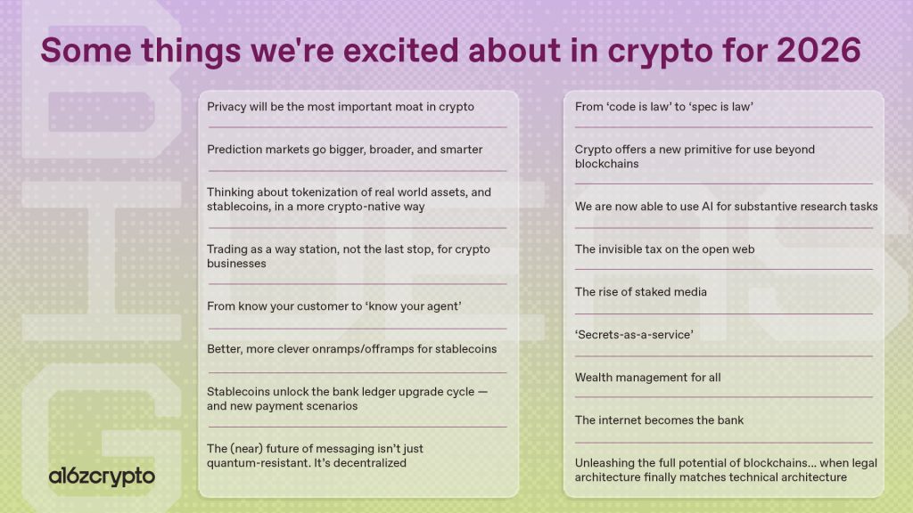 Risk sermayesi şirketi Andreessen Horowitz (a16z), kripto ekibinin yayımladığı son araştırmaya göre, stablecoin’ler, gerçek dünya varlıklarının tokenizasyonu ve gizlilik altyapılarının 2026’da kripto sektörünü şekillendirecek en kritik başlıklar arasında yer alacağını belirledi.