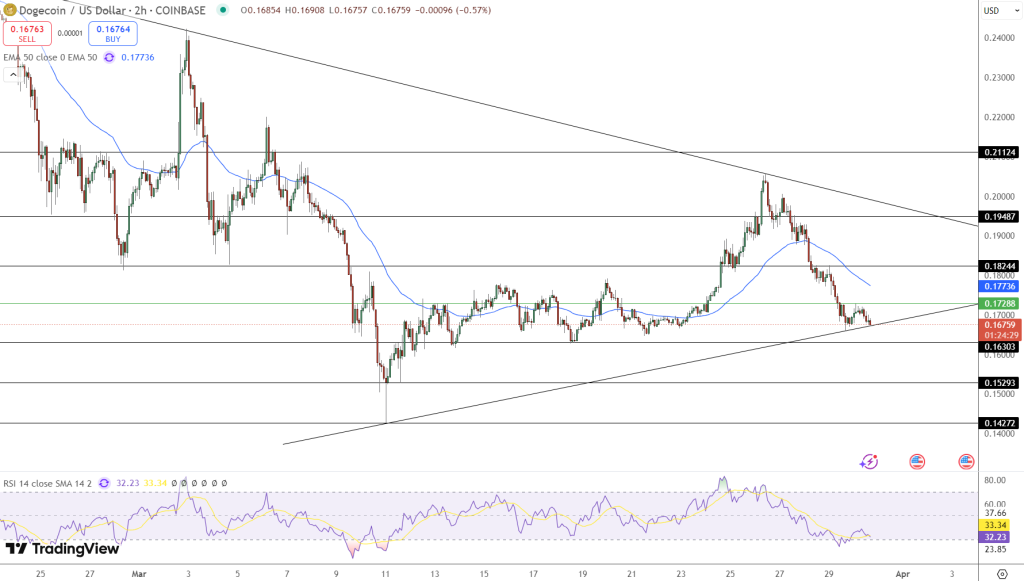 30 Mart itibarıyla DOGE, 0,1702 dolardan işlem görmekte ve simetrik bir üçgen içinde sıkışan fiyat hareketi, olası bir kırılma veya çöküş sinyalleri veriyor.