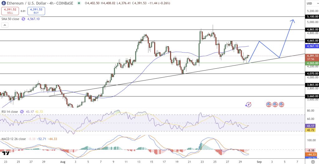 Fiyat, Ağustos başından gelen yükselen trend çizgisinin üzerinde kalmayı sürdürüyor; bu da genel yükseliş trendinin devam ettiğini gösteriyor. 50 günlük basit hareketli ortalama (SMA) 4.567 dolar, kısa vadeli direnç seviyesi olarak öne çıkıyor.