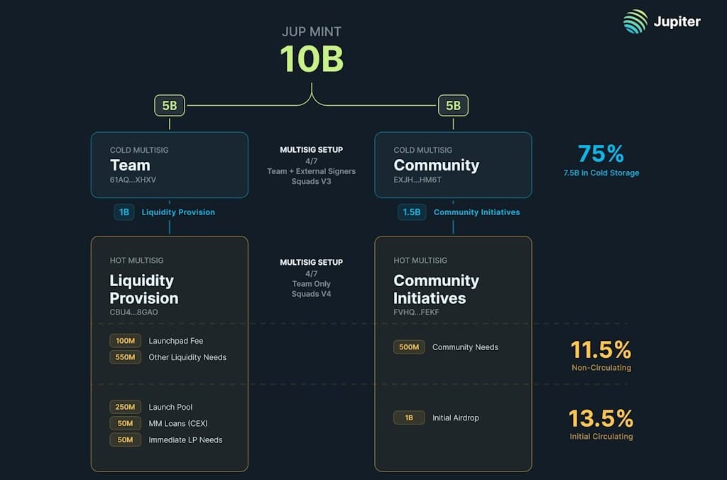 JUP tokeninin dağıtım stratejisi aşağıdaki gibidir: