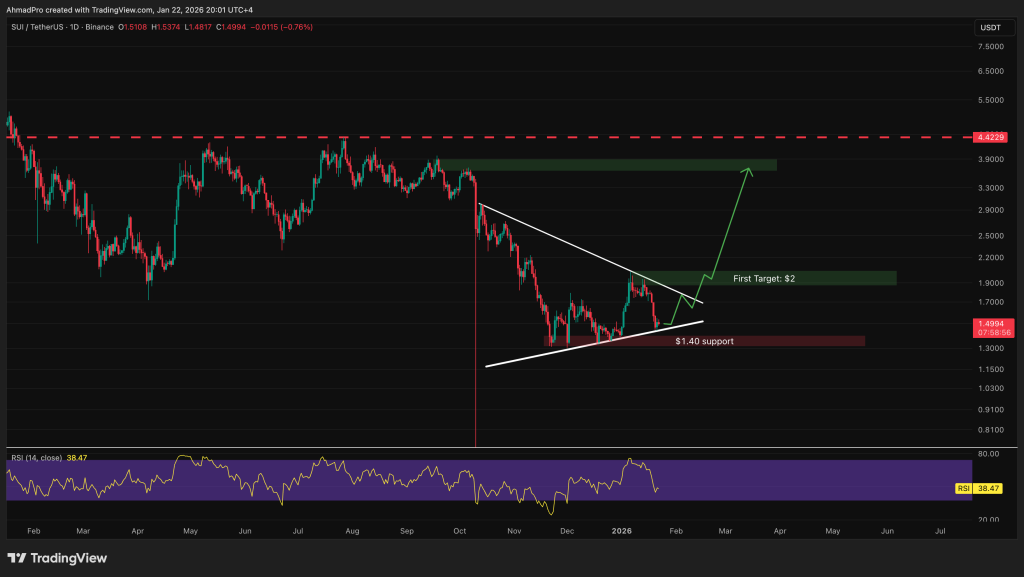 SUI, büyük bir satış dalgasının ardından dip seviyesini bulmaya çalışıyor. Fiyat şu an 1,40 dolar civarındaki yükselen destek ile önceki düşüş trendinden gelen alçalan direnç arasında daralıyor.