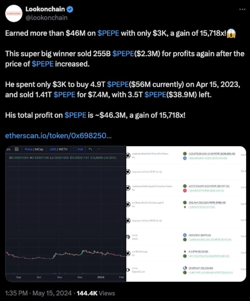 Lookonchain’e göre böyle bir potansiyele sahip olan Pepe Unchained, bu yılın başlarında bir yatırımcının 3.000 doları 46 milyon dolara dönüştürdüğü $PEPE’nin olağanüstü başarısını pekala tekrarlayabilir.