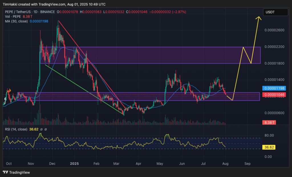 Şu anda yaklaşık 0,0000105 dolardan işlem gören PEPE, son bir ayda %10,4 artışla Bitcoin ve Dogecoin’in 30 günlük performansını geride bıraktı. Son 24 saatte %9 değer kaybetmiş olsa da, bu meme coin piyasasının genel eğilimiyle uyumlu; çünkü sektör genelinde %7 artış yaşanırken Dogecoin ve Shiba Inu gibi öncüler %7 ila %8 oranında düştü.