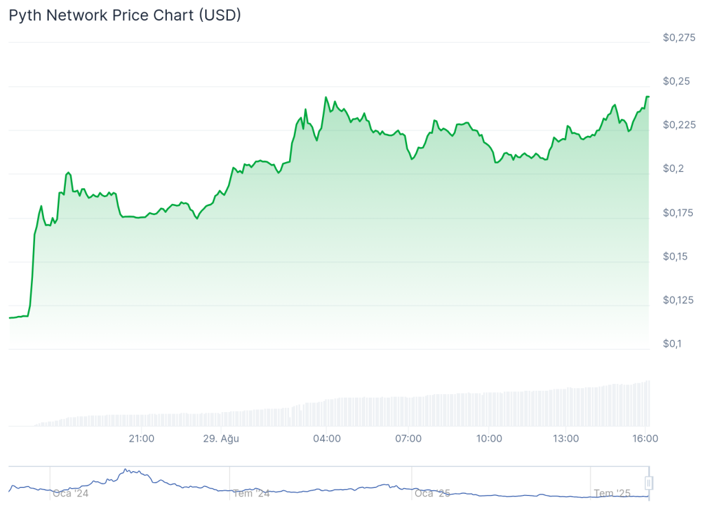 Haberin duyulmasıyla PYTH fiyatı yüzde 90’ın üzerinde yükseldi. Bazı borsalarda anlık olarak artış yüzde 100’ü buldu. Token, 0,22–0,24 dolar arasında dalgalanırken, işlem hacimleri de ciddi şekilde arttı. Büyük yatırımcıların (balina) alımları, yükselişi destekleyen bir diğer faktör olarak öne çıktı.