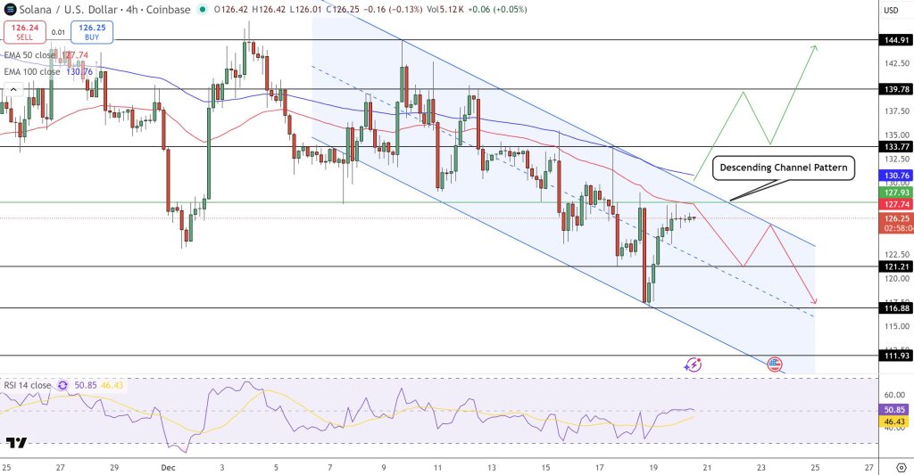 Teknik açıdan bakıldığında Solana fiyat tahmini hâlâ temkinli. SOL/USD, ayın başında 145 dolar bölgesinden gelen reddin ardından 4 saatlik grafikte düşüş kanalı içinde işlem görüyor. Fiyatın 127,70 dolar civarındaki 50 EMA’nın ve 130,80 dolar yakınındaki 100 EMA’nın altına sarkması, kısa vadede satıcıların kontrolünü teyit ediyor.