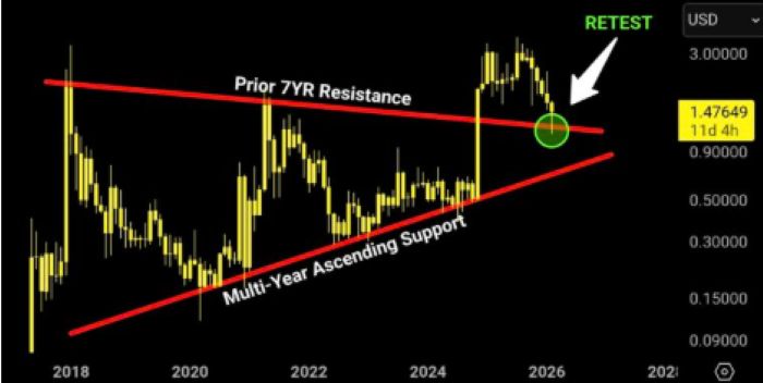 XRP, 18 Şubat 2026 itibarıyla 7 yıllık direnç çizgisini başarıyla test etti.