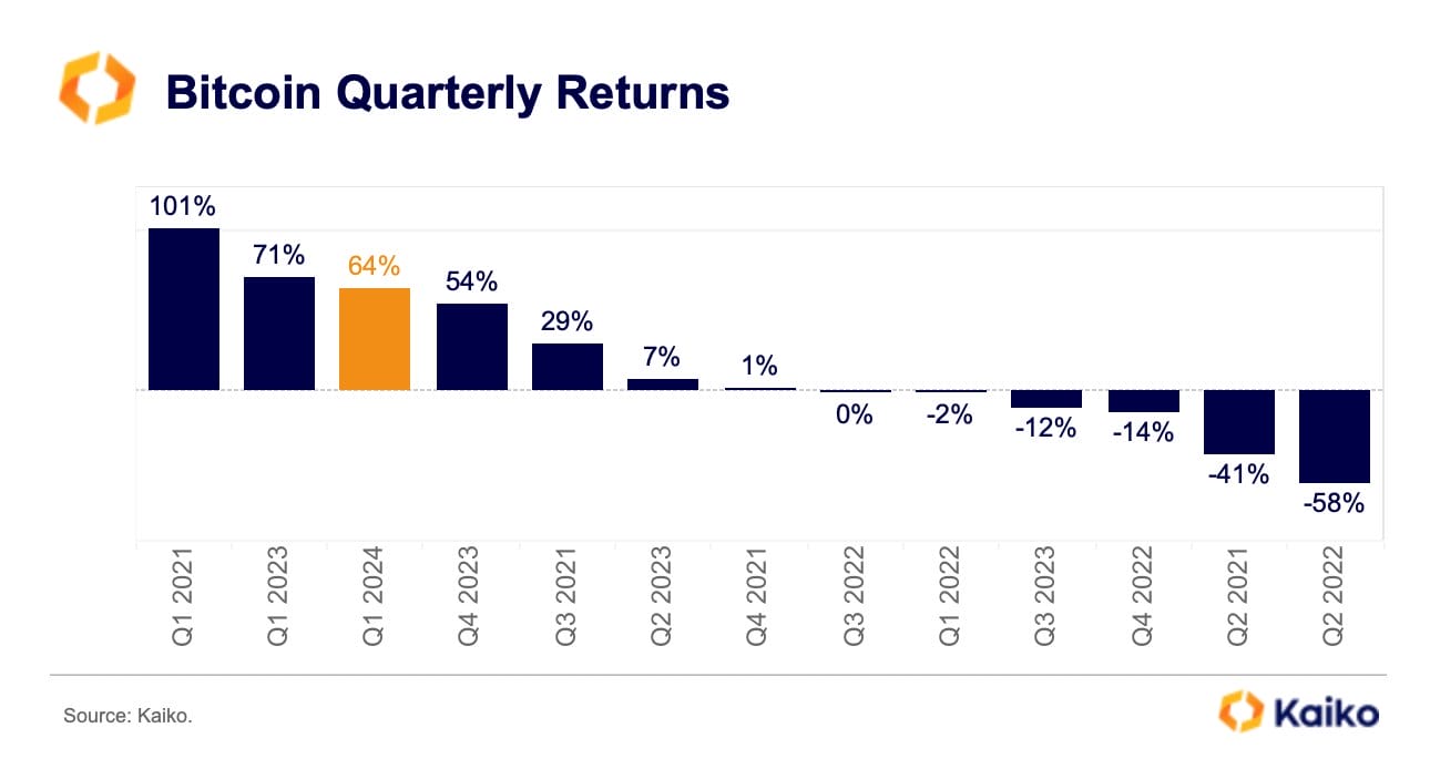 Kaiko’ya göre, Bitcoin son üç yılın ilk çeyreğinde %64’lük bir artış gösterdi ve düşük spot Bitcoin ETF girişlerinin yakın zamanda toparlanması bekleniyor.
