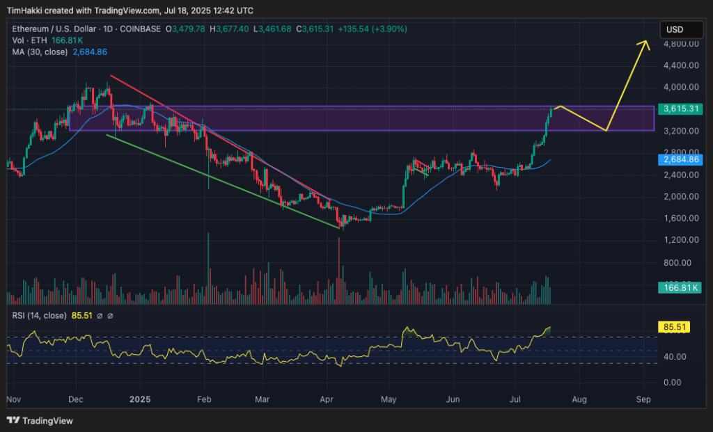 Ancak Ethereum’un RSI’si 86 seviyesinde olduğu için yakın zamanda kar alımları görülebilir. Ethereum’un kilit direnç seviyesi 3.600 dolarda bulunurken, 3.200 dolarda ise güçlü bir destek bulunuyor.