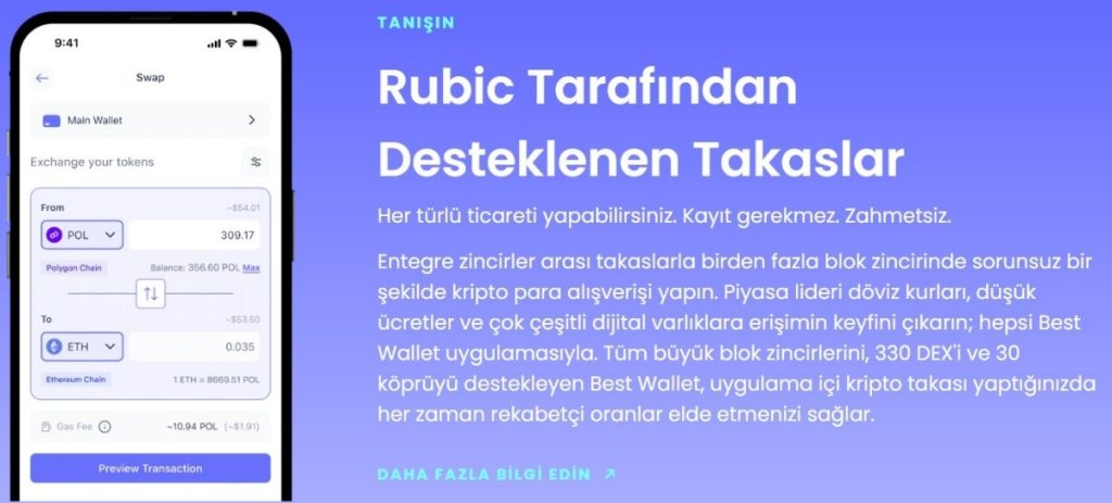 Rubic entegrasyonu, 330 farklı merkeziyetsiz borsanın ve 30’dan fazla zincir köprüsünün arasından en avantajlı fiyatları otomatik olarak tarayarak kullanıcıya en uygun işlemi sunuyor.
