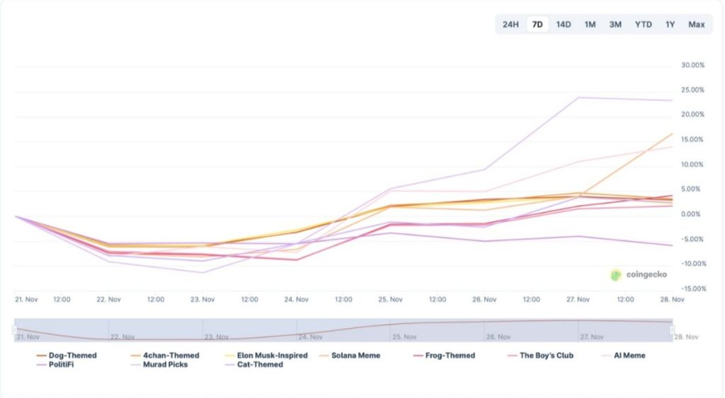 Köpek ve kedi temalı projeler de haftayı yukarıda kapatırken, tek kaybeden segment PolitiFi oldu ve %5 geriledi.