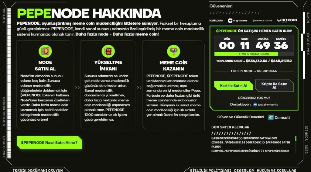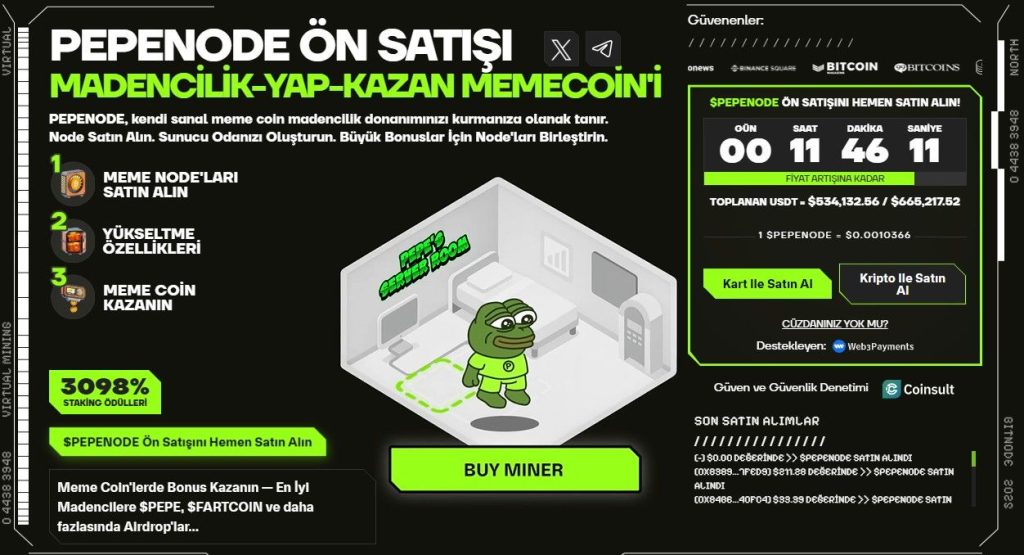 Kripto dünyasında mine-to-earn modelini kullanan ilk ve tek meme coin olması, Pepe markasıyla güçlü bağı ve düşük piyasa değeri, PEPENODE’u 2025’in en dikkat çeken projelerinden biri hâline getiriyor.