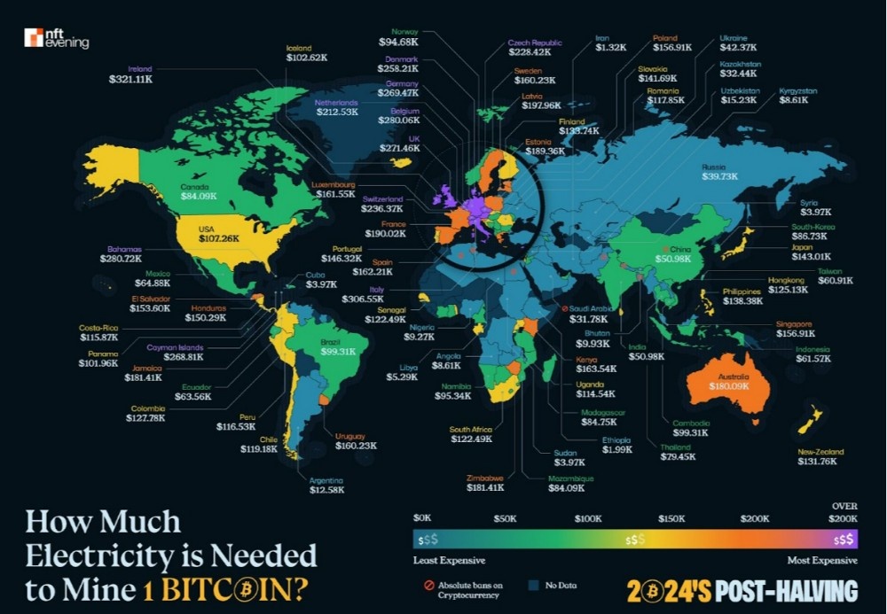 Bir BTC üretmenin ortalama maliyeti: İrlanda: $321,111, ABD: $107,260, İran: $1,320, Etiyopya: $1,909.