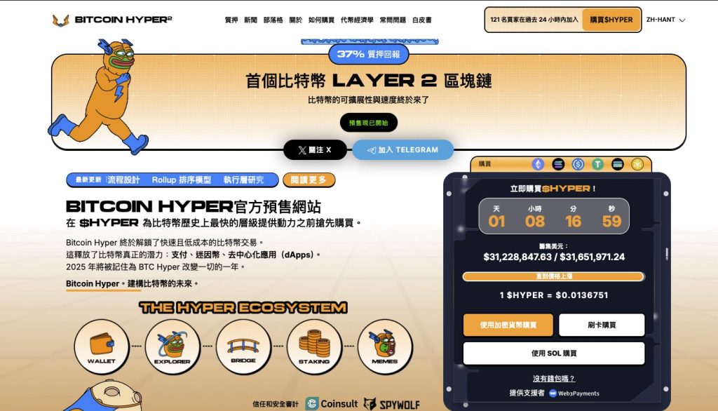 Bitcoin Hyper 在確保安全性的基礎上,加入了其最欠缺的元素:Solana 級別的速度。結果是:極速且低成本的智能合約、去中心化應用程式 (dApps),甚至是受比特幣保護的迷因幣創建。 該項目已通過 Consult 審計,隨著採納度提升,重點強調信任與擴展性。目前勢頭強勁,預售金額已突破 3,120 萬美元,在下一輪漲價前,代幣價格僅為 $0.013675。