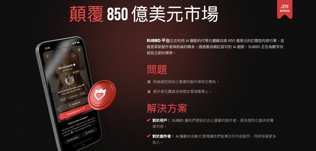 SUBBD($SUBBD)正是順應這一趨勢而生,這是一個以 AI 驅動的內容平台,瞄準了價值 850 億美元的創作者經濟,旨在幫助用戶直接從內容中獲取收入,而非僅靠投機。