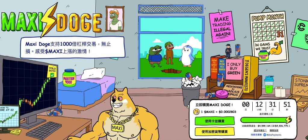 在機構敘事升溫的同時,迷因市場也以更鮮明的文化打法爭奪注意力。Maxi Doge($MAXI)以健身、極限能量與槓桿精神打造高度戲劇化的品牌調性,讓迷因不再只依賴單一笑點擴散,而是用視覺與文化記憶點建立辨識度。
