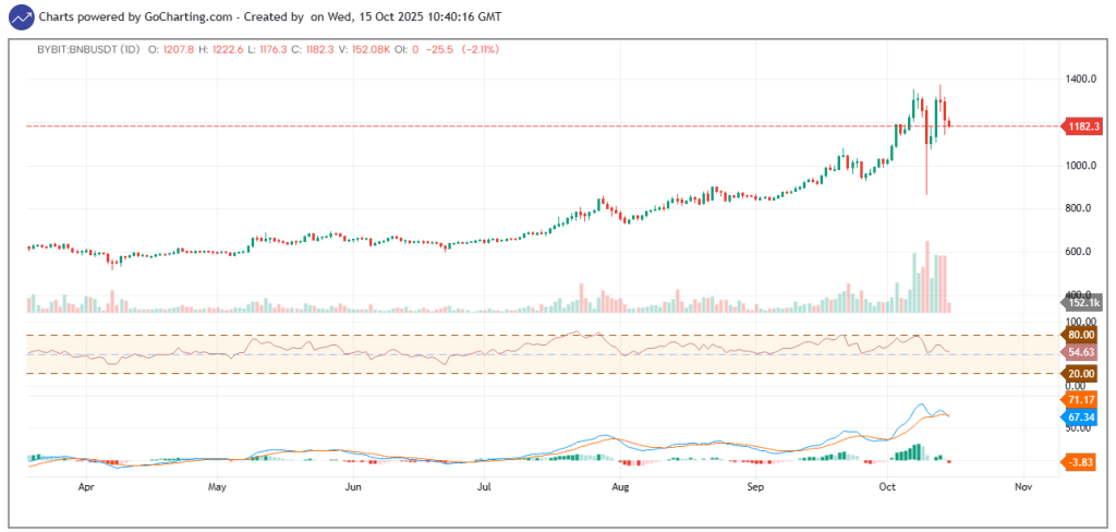 Hiện tại, giá BNB đang dao động quanh mức 1.200 USD, giảm khoảng 11% trong vòng 24 giờ qua, nhưng đồng thời vẫn thể hiện mức tăng ấn tượng lên tới 28% trong vòng một tháng. Trong vài tuần gần đây, BNB đã có sự tăng trưởng ổn định, và biểu đồ kỹ thuật hiện tại cho thấy khả năng đồng coin này sẽ sớm có một đợt bứt phá mới.