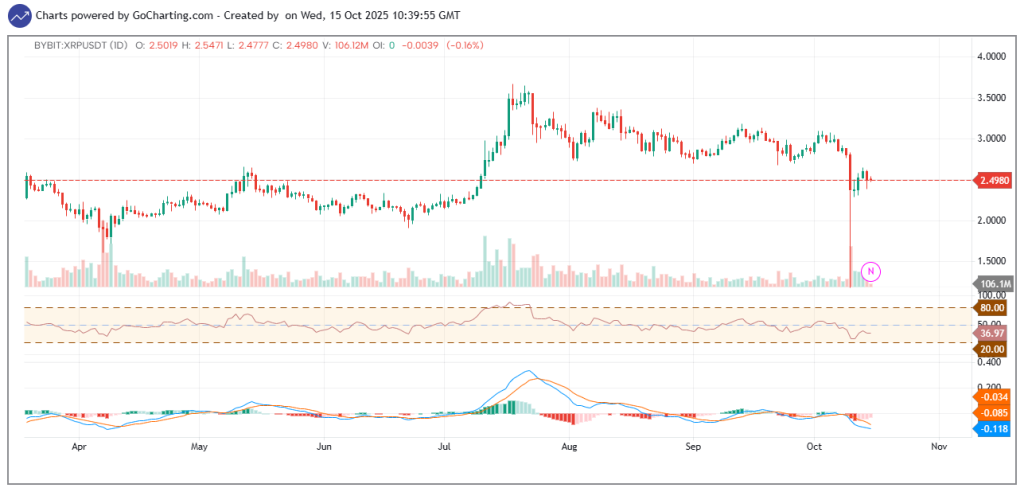 Trong những tuần gần đây, XRP đã trải qua một giai đoạn rất khó khăn khi giá của nó giảm mạnh từ mức 3,09 USD vào đầu tháng 10 xuống còn 2,47 USD vào thời điểm hiện tại. Cụ thể, trong vòng 24 giờ qua, XRP đã mất khoảng 6% giá trị; trong vòng một tuần, mức giảm là 17%; và trong một tháng, con số này lên tới 20%. Dù vậy, nếu nhìn trên khung thời gian dài hơn, XRP vẫn ghi nhận mức tăng trưởng ấn tượng lên đến 360% trong vòng một năm qua.