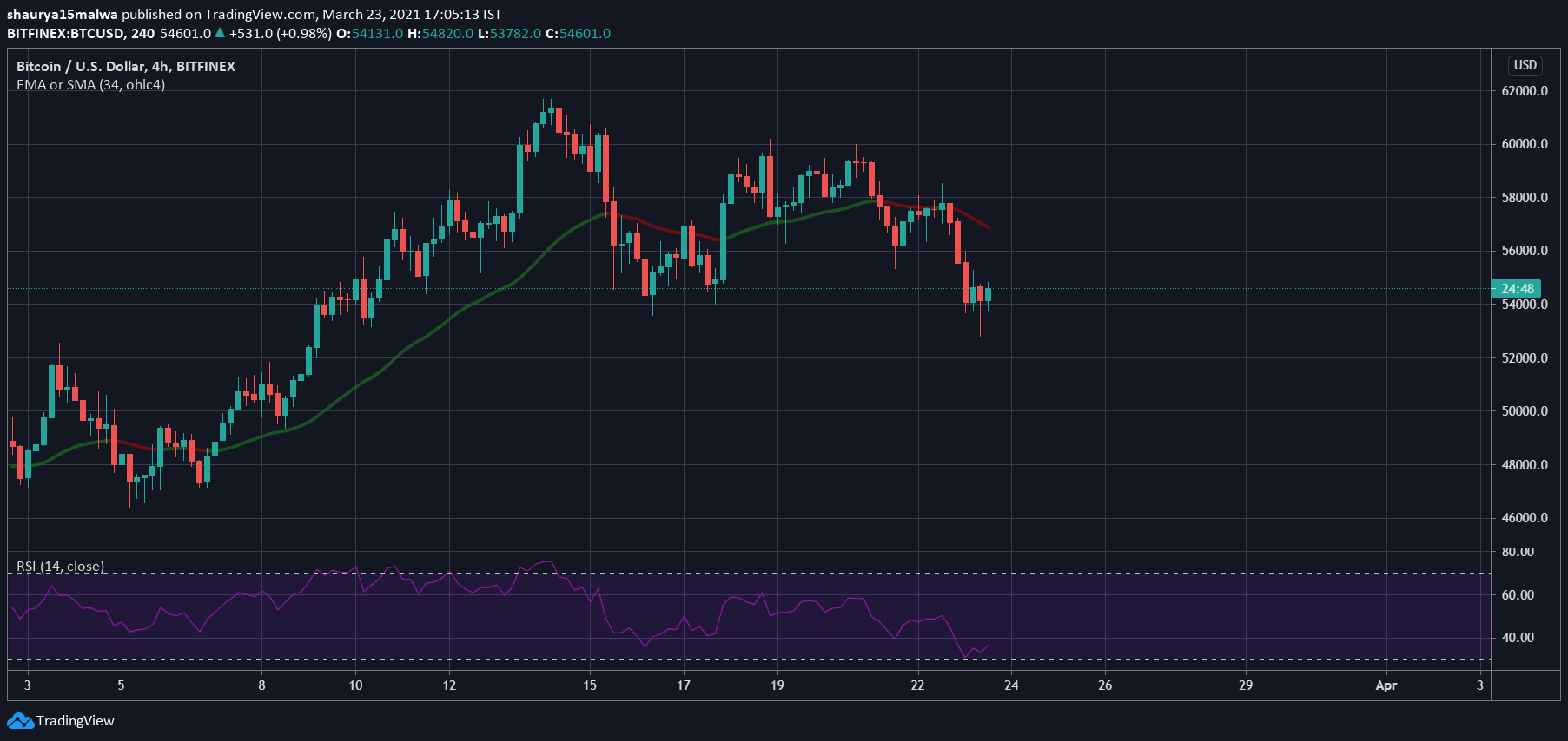 Bitcoin fell to under $54,000 in the morning hours amidst a broader sell-off in the crypto market. The asset later recovered slightly and traded over $54,700 at press time.